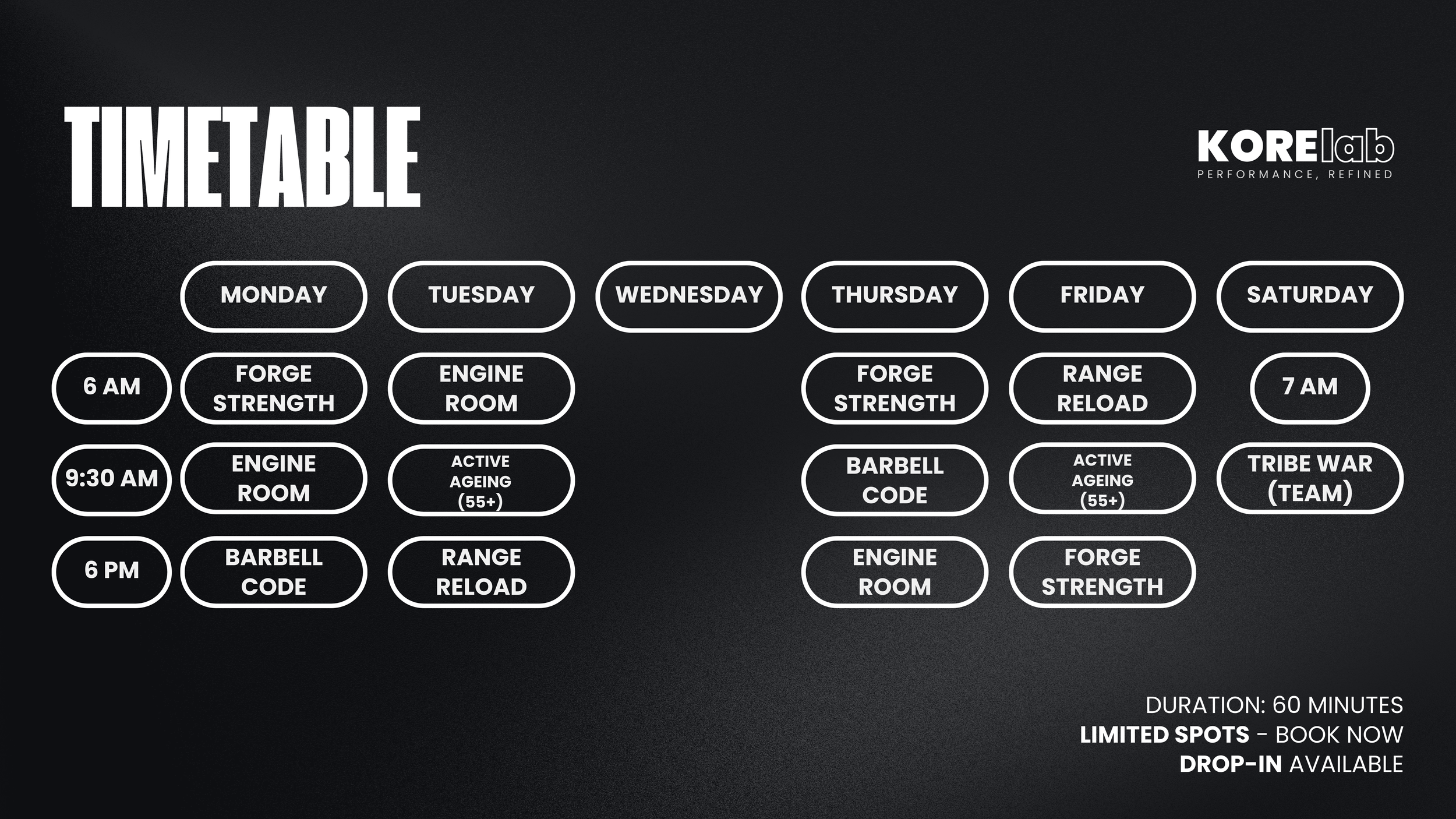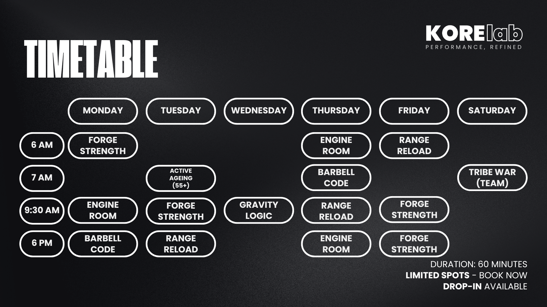 At KORElab, we believe fitness should be challenging, fun, and accessible for everyone. Whether you’re a beginner, returning to training, or a seasoned athlete, our classes are designed to help you reach your goals in a supportive, results-focused environment.